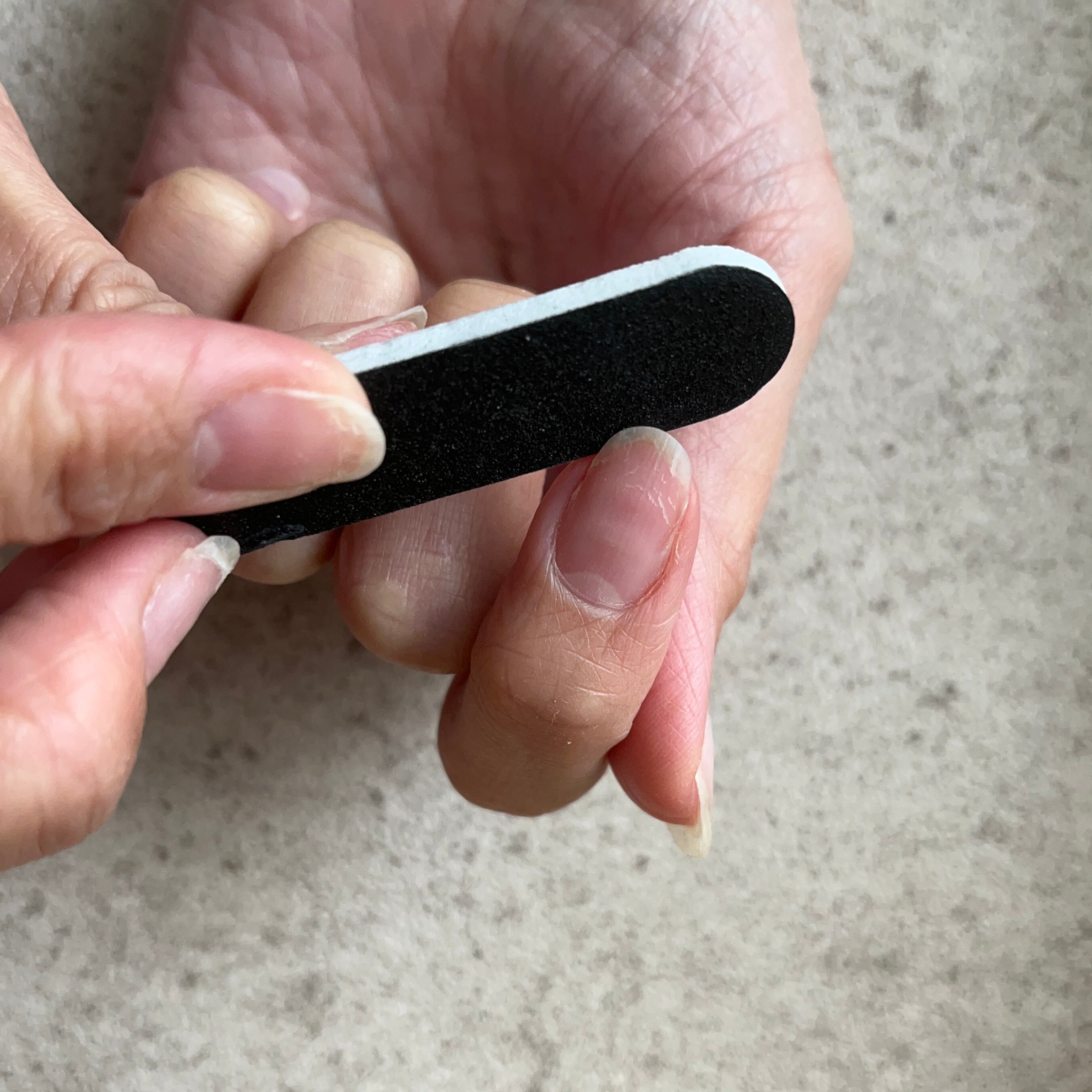 ・自爪を整えます。自爪はネイルチップより短い方がネイルチップとの密着性が上がります。こちらの作業をして頂くことをおすすめしています。自爪が長い場合は爪切りなどで切ってからヤスリで整えてください。