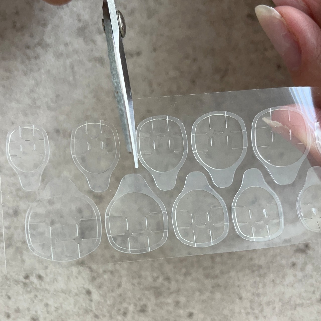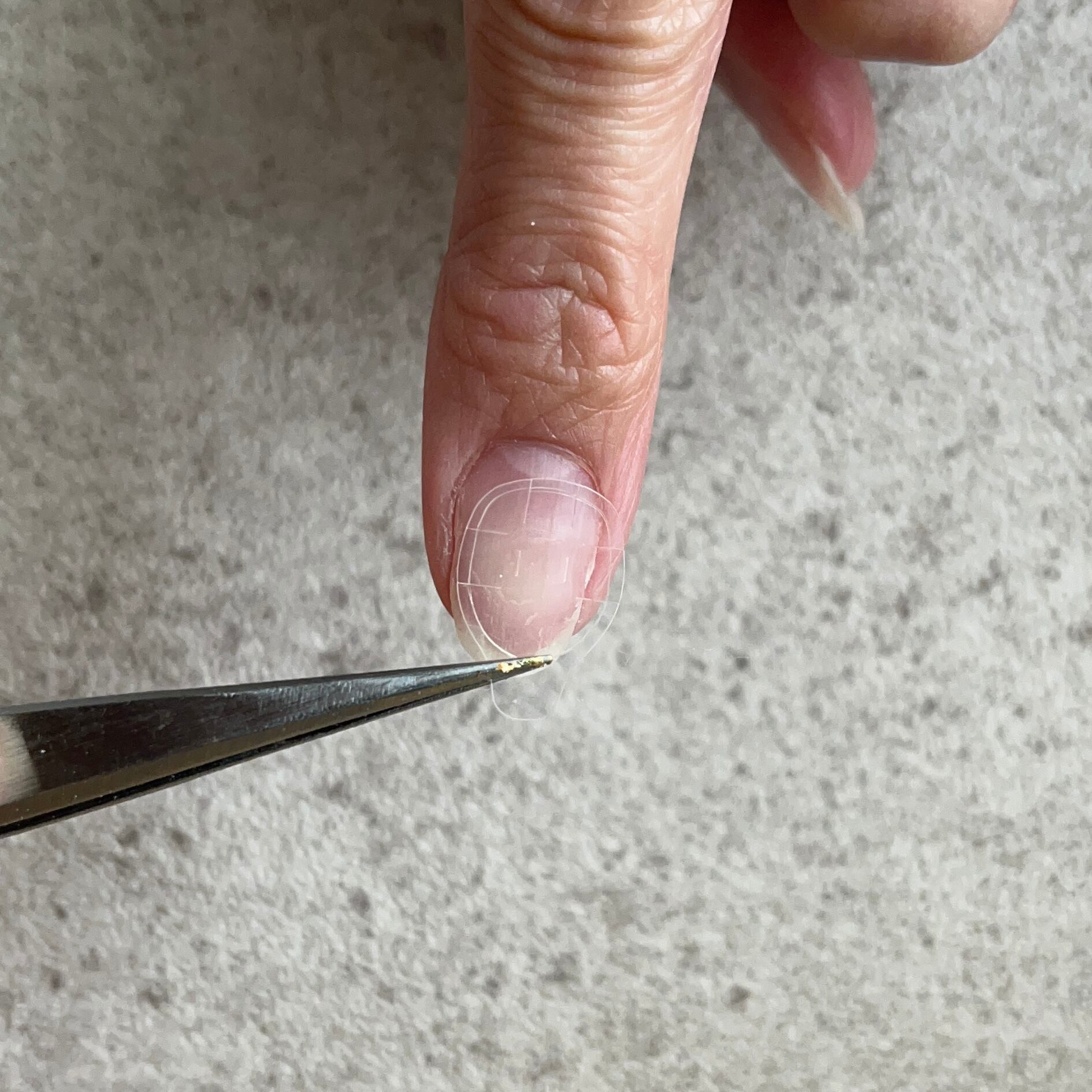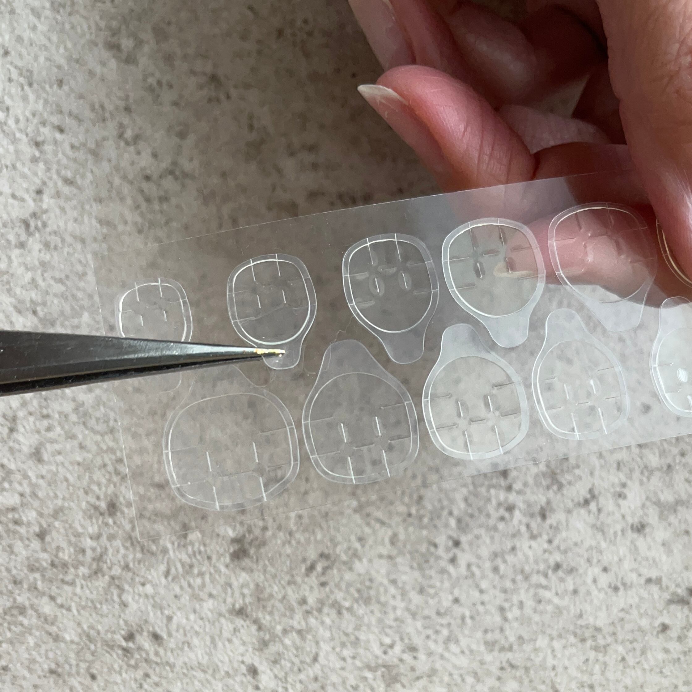 ・自爪の大きさに合わせた接着グミを自爪に貼り付けます。はみ出す場合は接着部分を触らないようハサミ等でカットして下さい。